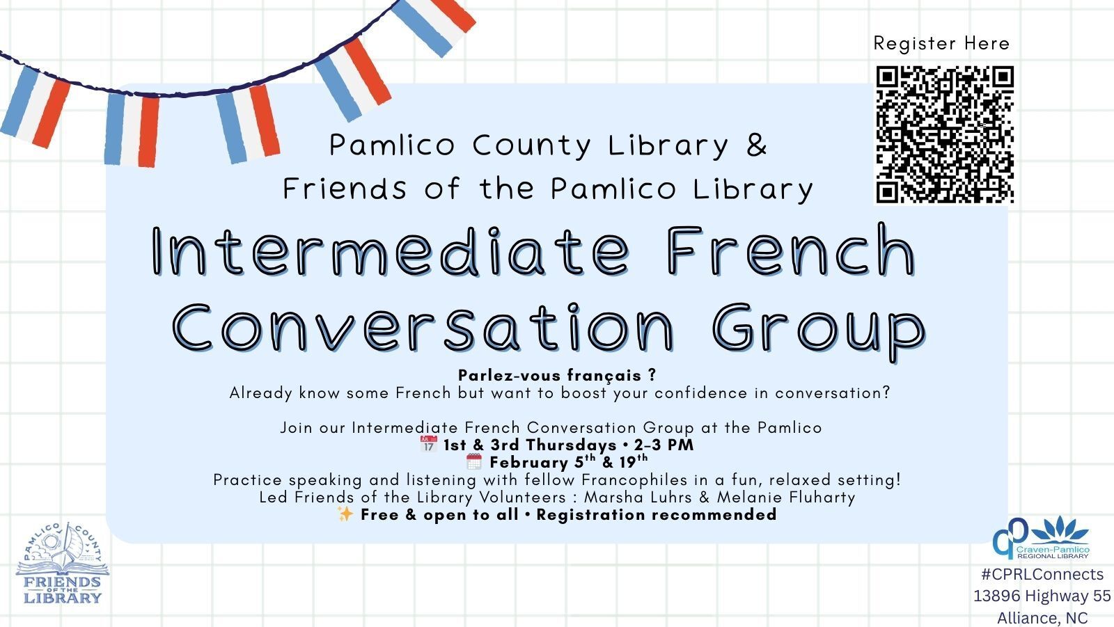 Intermediate French Conversation Group. The group meets on the first and third Thursday at the new Pamlico County Library, 13896 NC 55 in Alliance in the community room at the rear of the building. For questions and to RSVP contact Marsha at [email protected] or call/text 252-617-5960, 2-3 p.m.