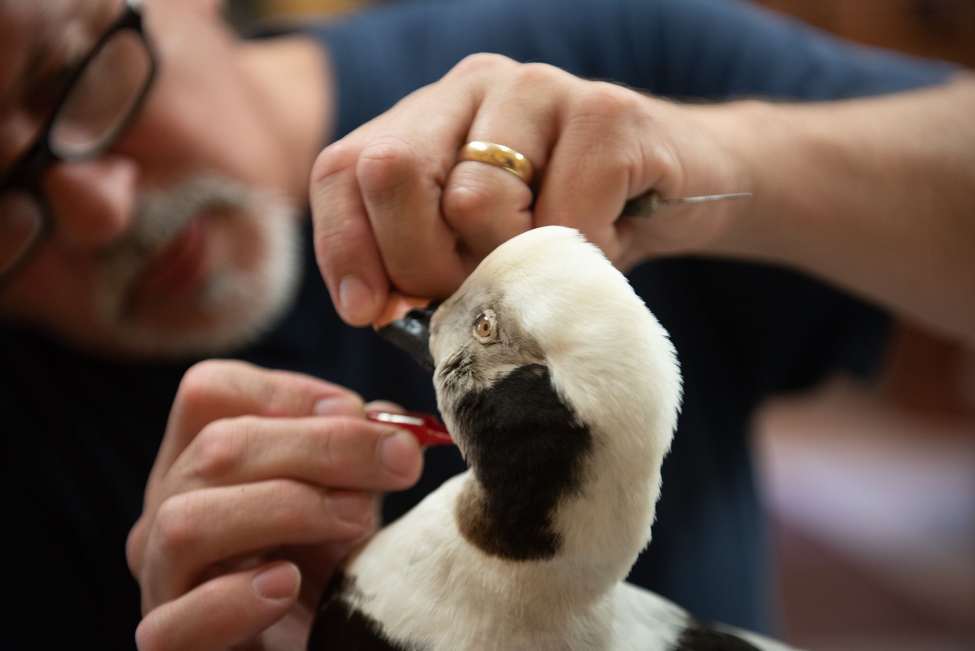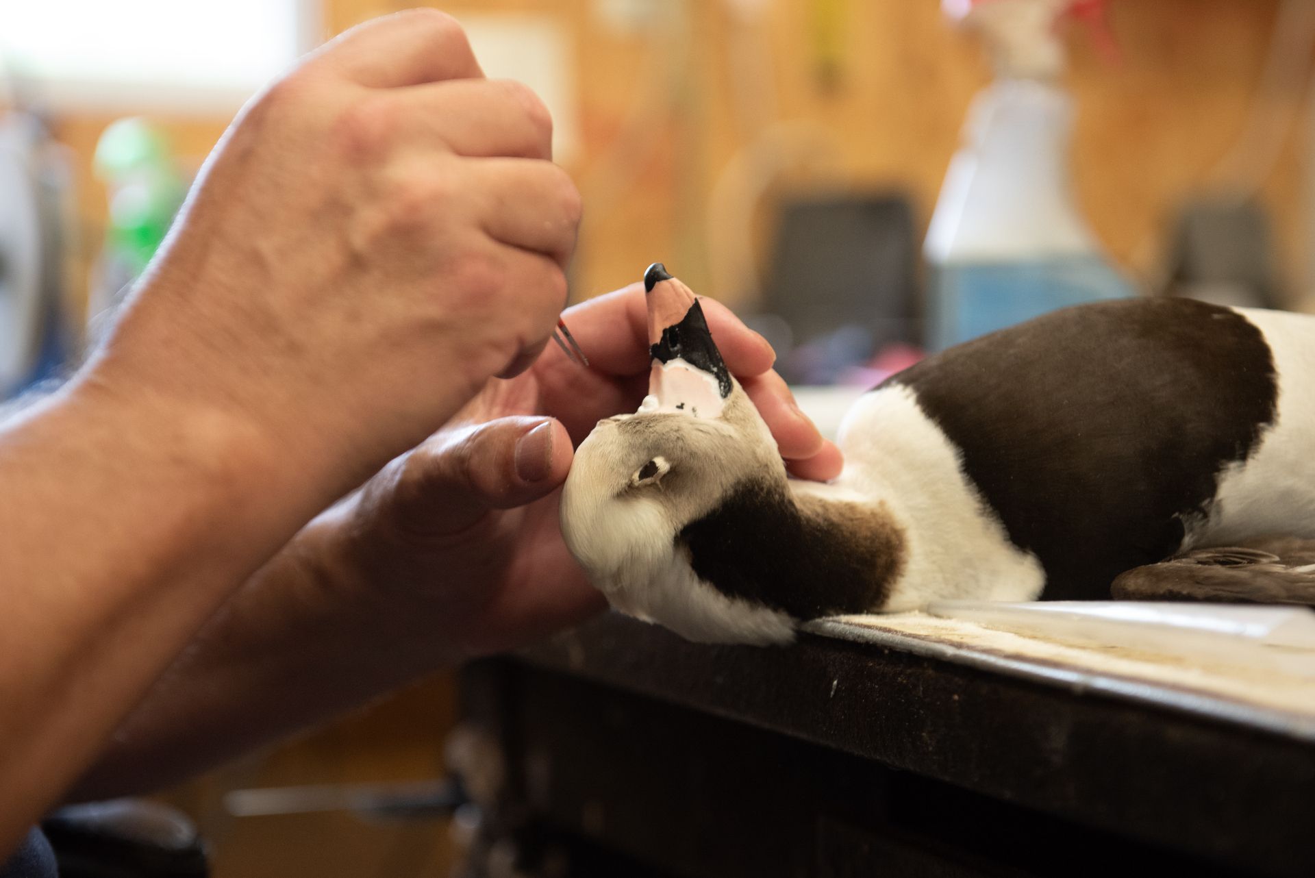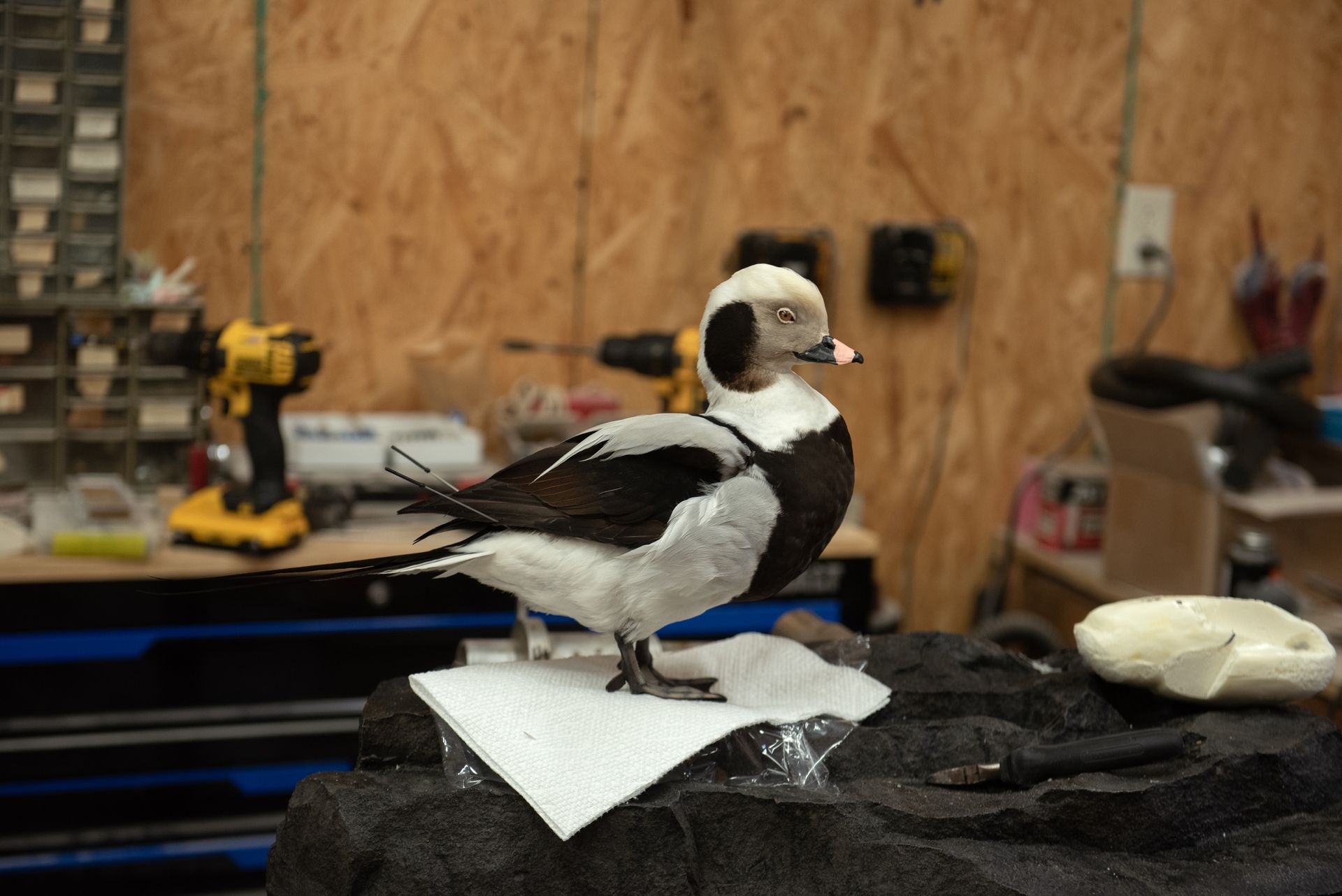 On the day we meet, he’s working on two sea ducks, formerly known as oldsquaw and now called long-tailed ducks. They’ll be mounted standing, looking out at the observer.