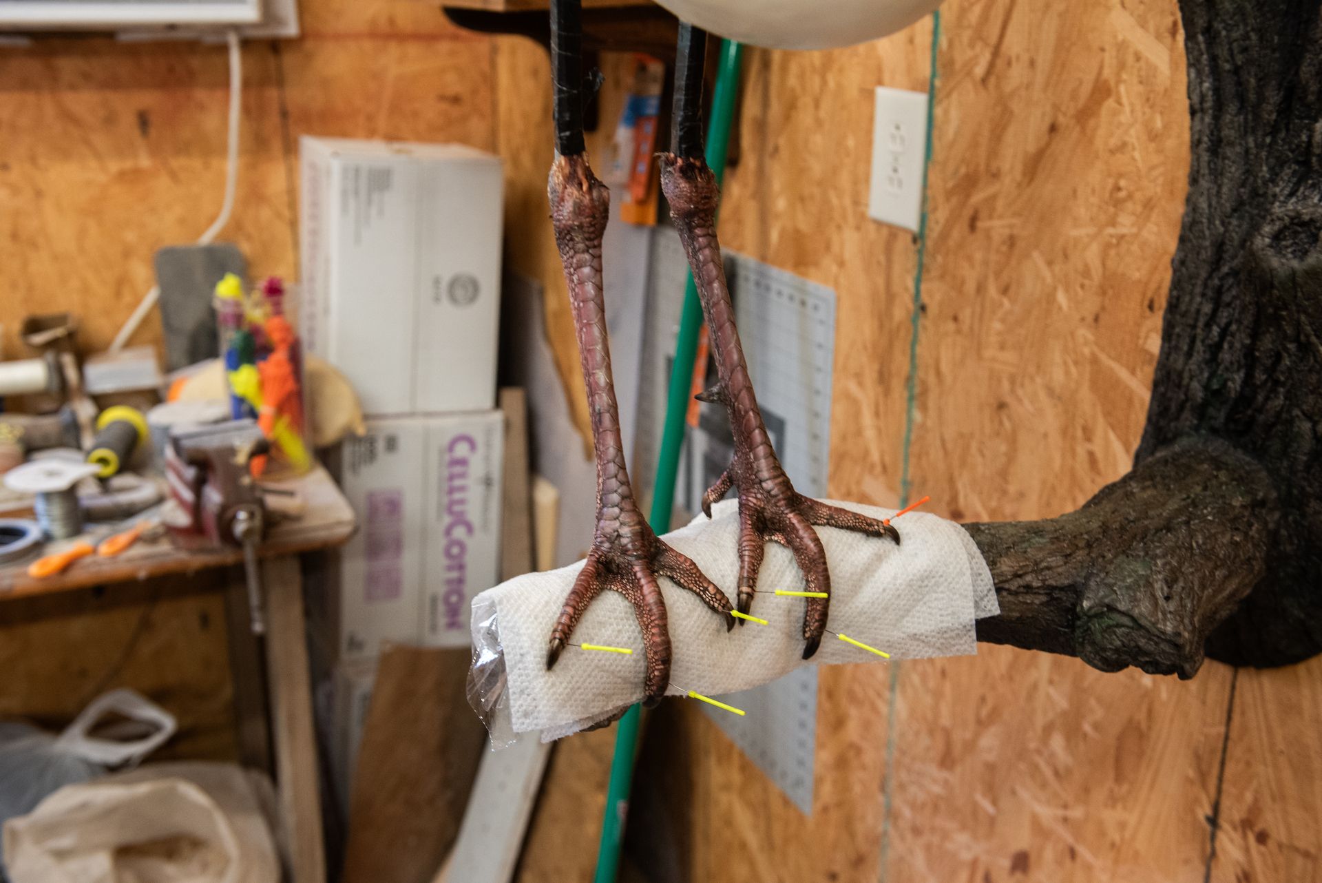 Turkey feet placed on the mount. Once dry, Nethercutt will apply paint to maintain a vibrant life-like look.