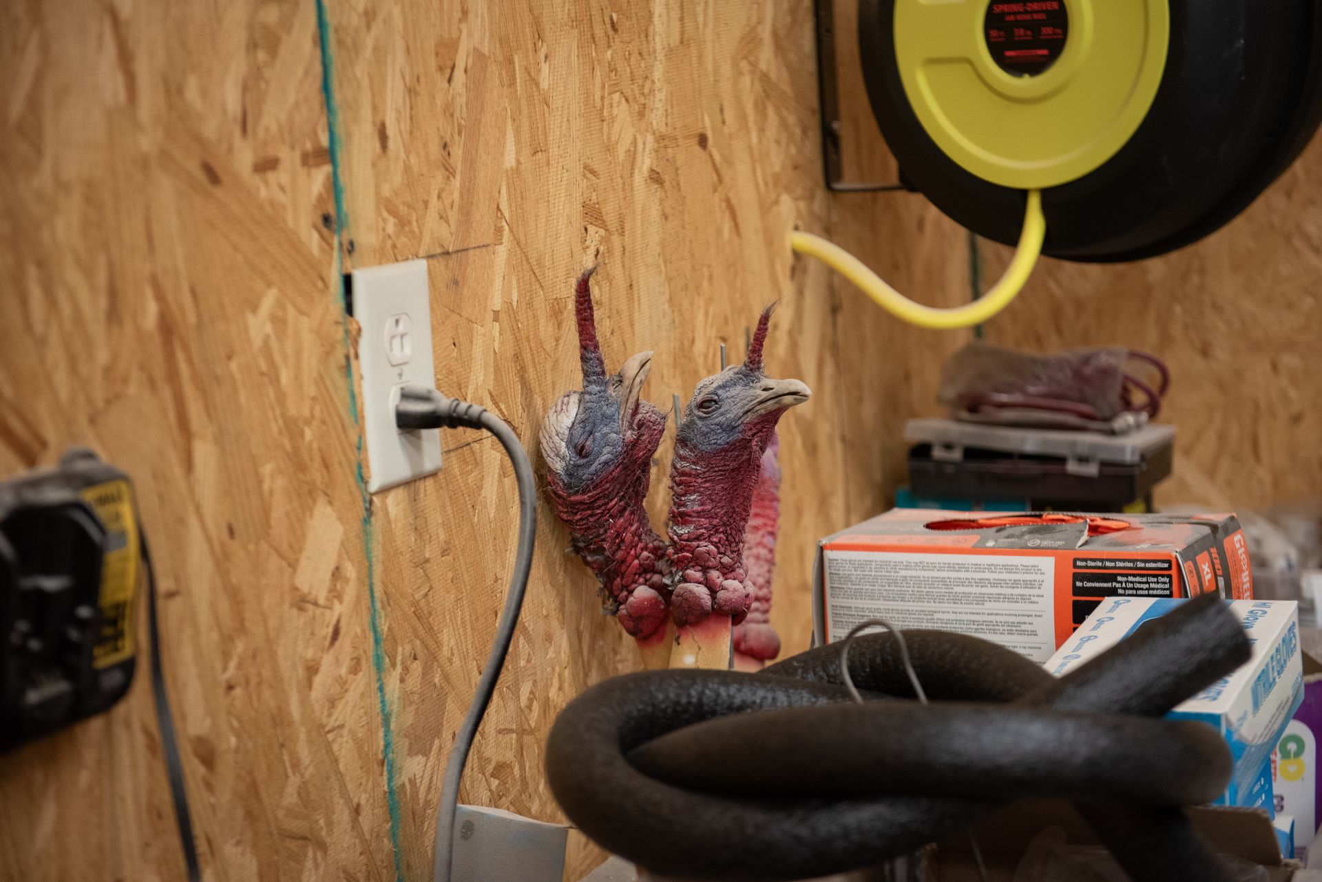Painted turkey heads waiting for their body mounts. They’ve been waiting a while. These are for his personal collection, but the work for clients comes first. (Photo by Allison DeWeese)