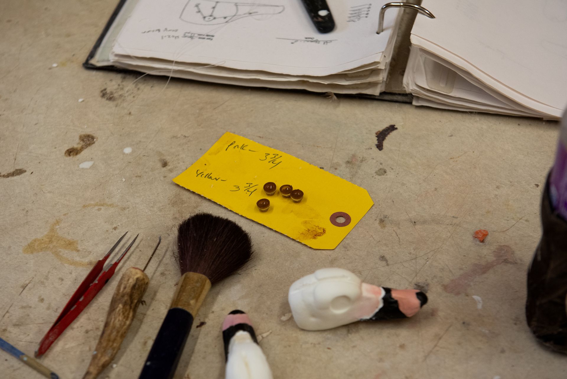 Near his worktable are the feet and tail feathers of two turkeys, both assembled on molded foam bodies and mounted on stands. The skins and heads will go on after the feet are dry and painted. Several turkey heads — not from the same turkeys — wait across the room for their bodies to be finished.